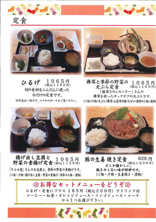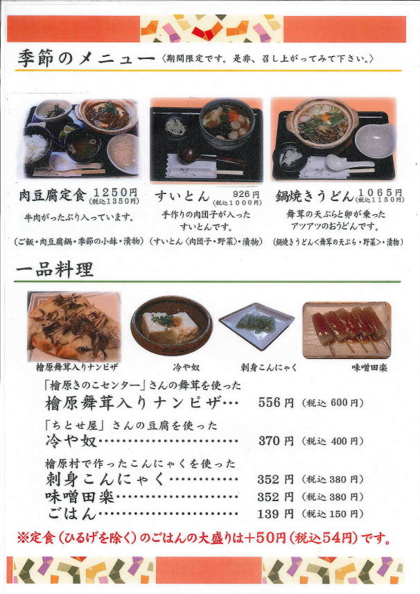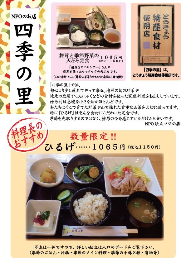 | 四季の里の「ひるげ」は檜原村の「うちの畑」でとれた野菜中心に、 家庭の食卓で食べるやさしい味にしあげています。 檜原の旬の野菜は都心より少し遅れてやってきます。 畑も急峻な小さな畑でとれます。 私たちはそこで育った野菜や山で採れた貴重な山菜を大切に使っています。 季節を先取りするのではなく、檜原の今を感じていただけるように、 ひるげは特にこだわった定食です。 豆腐はご近所の「ちとせ屋」さんのお豆腐を毎朝買いに行って作ります。 舞茸は標高840mの場所にある「檜原きのこセンター」で栽培し、 檜原村の10月頃の気温・湿度を保つことで、天然ものに限りなく近い舞茸を使っています。 どれも手作りのため量産していませんが、お電話いただければお食事もお席もご用意いたします。 又、貸し切りのご利用もお受けいたします。 パーティーやお食事会、ギャラリーや会議のご相談もお受けいたしますので、お気軽にお問合せください。 |